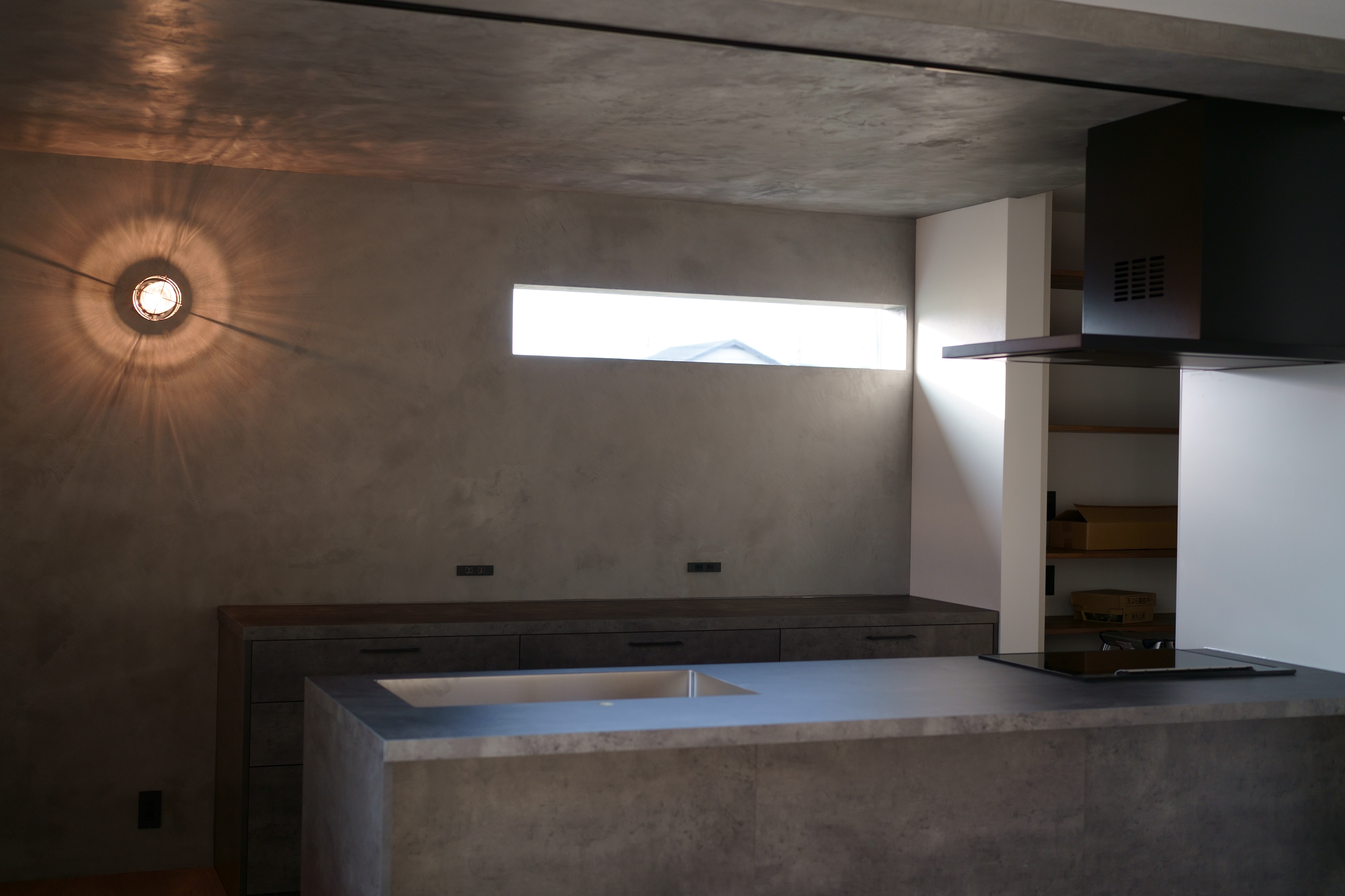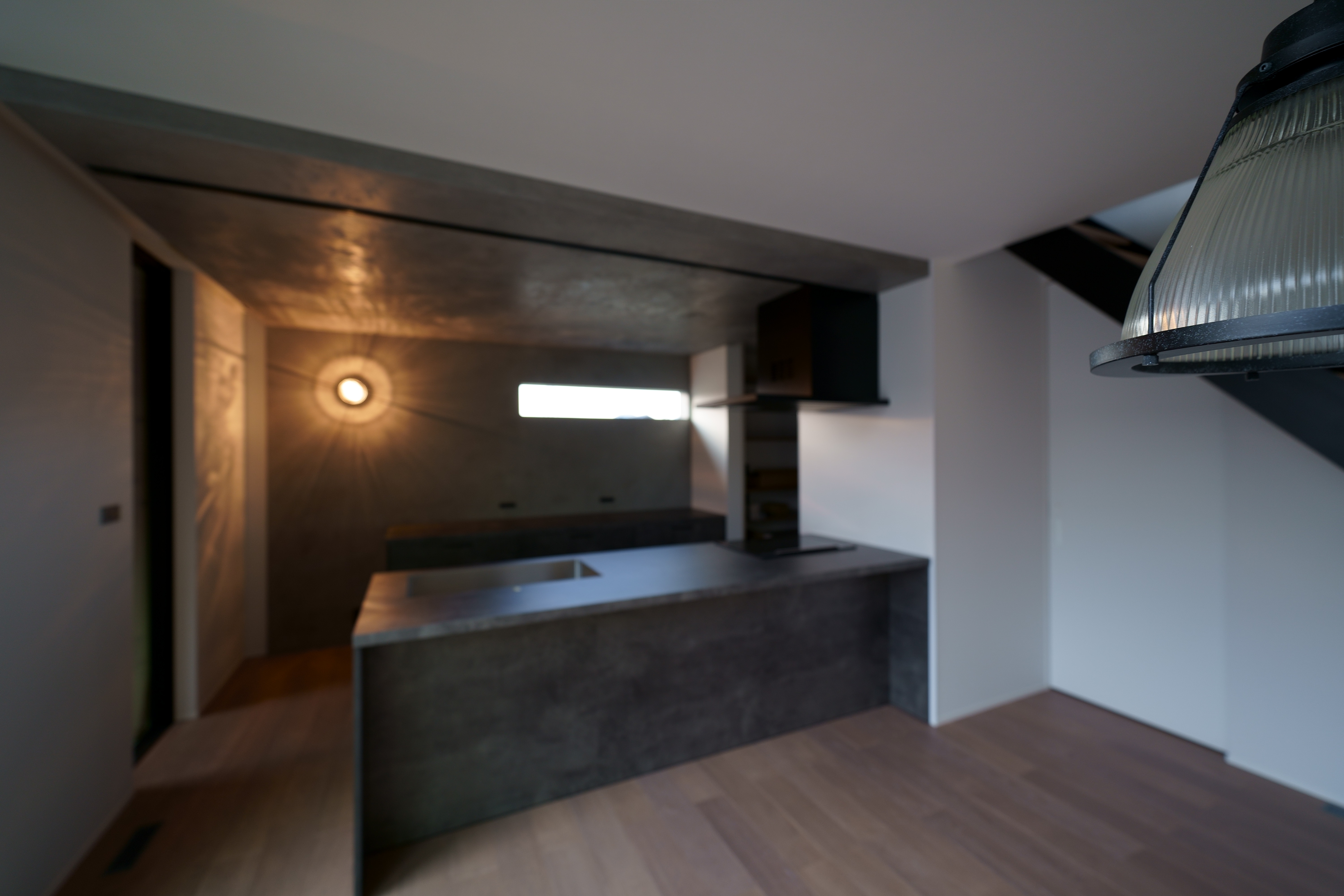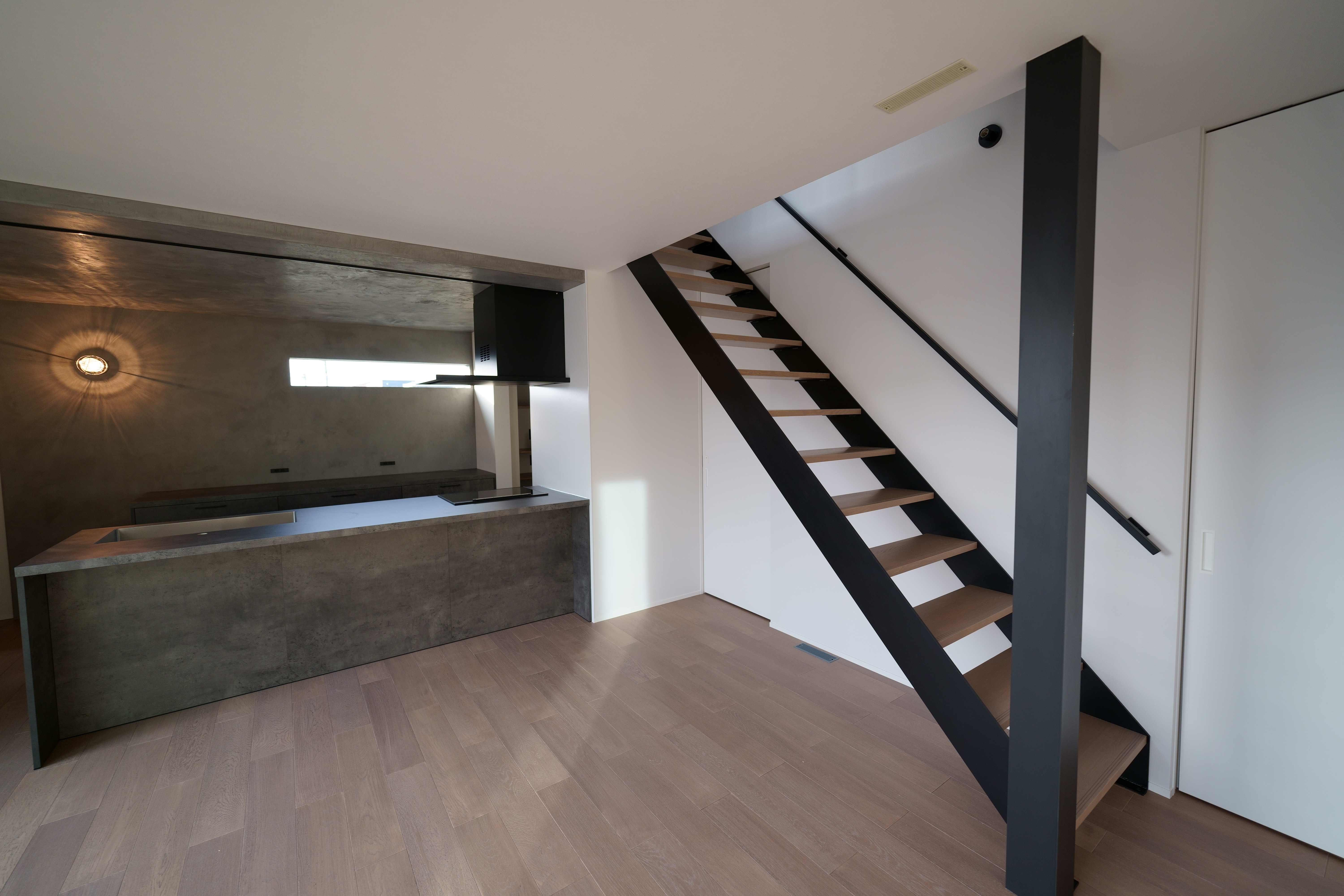 窓から自然光が差し込む開放的な吹き抜け空間と、コンクリート調のキッチン・壁面が美しいコントラストを生む家。 階段やシンプルな照明が、空間に引き締まった印象を与えます。 素材感を活かしたミニマルなデザインで、落ち着きと洗練を両立した住まいです。 [中野町 I様邸 / 2022.11]