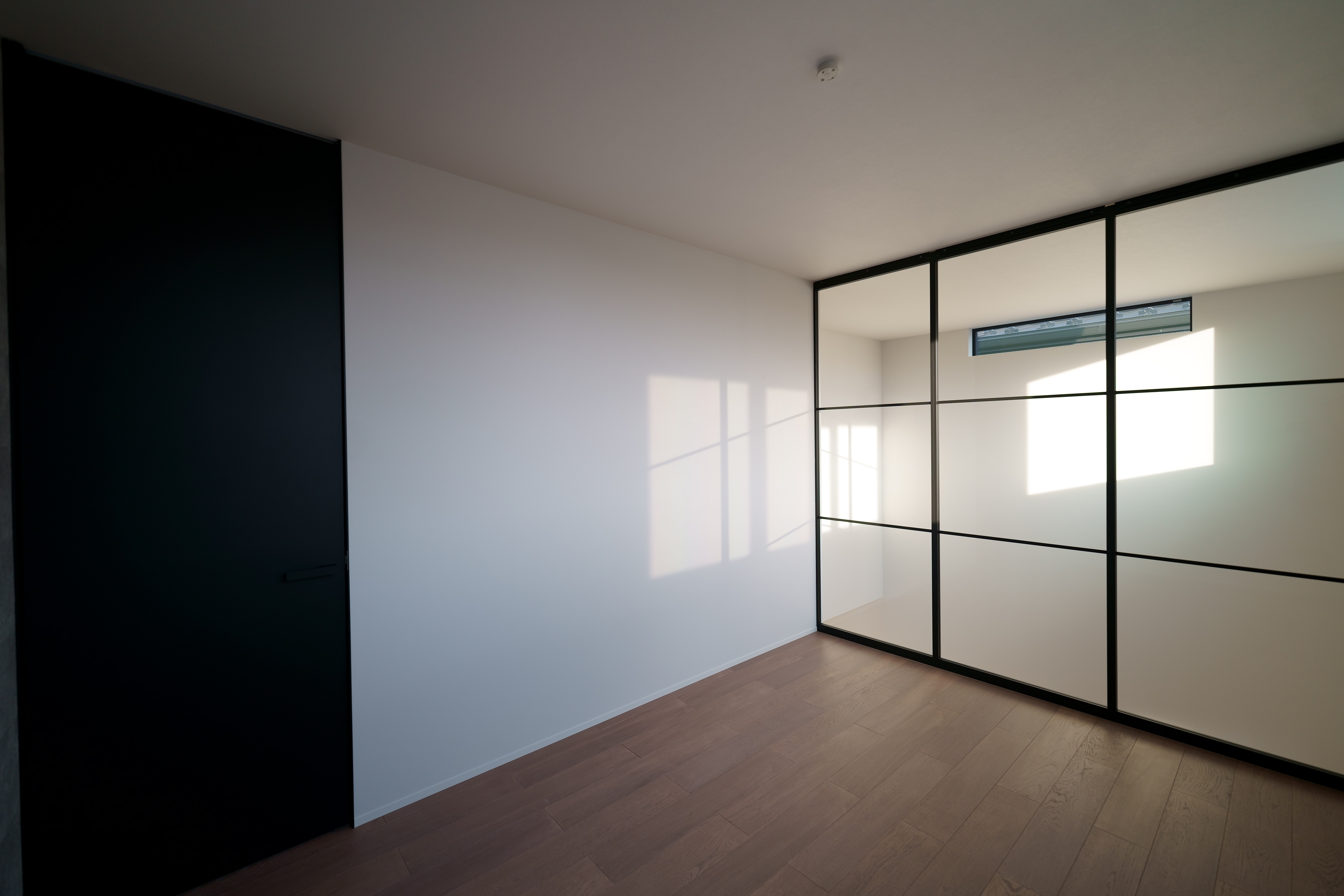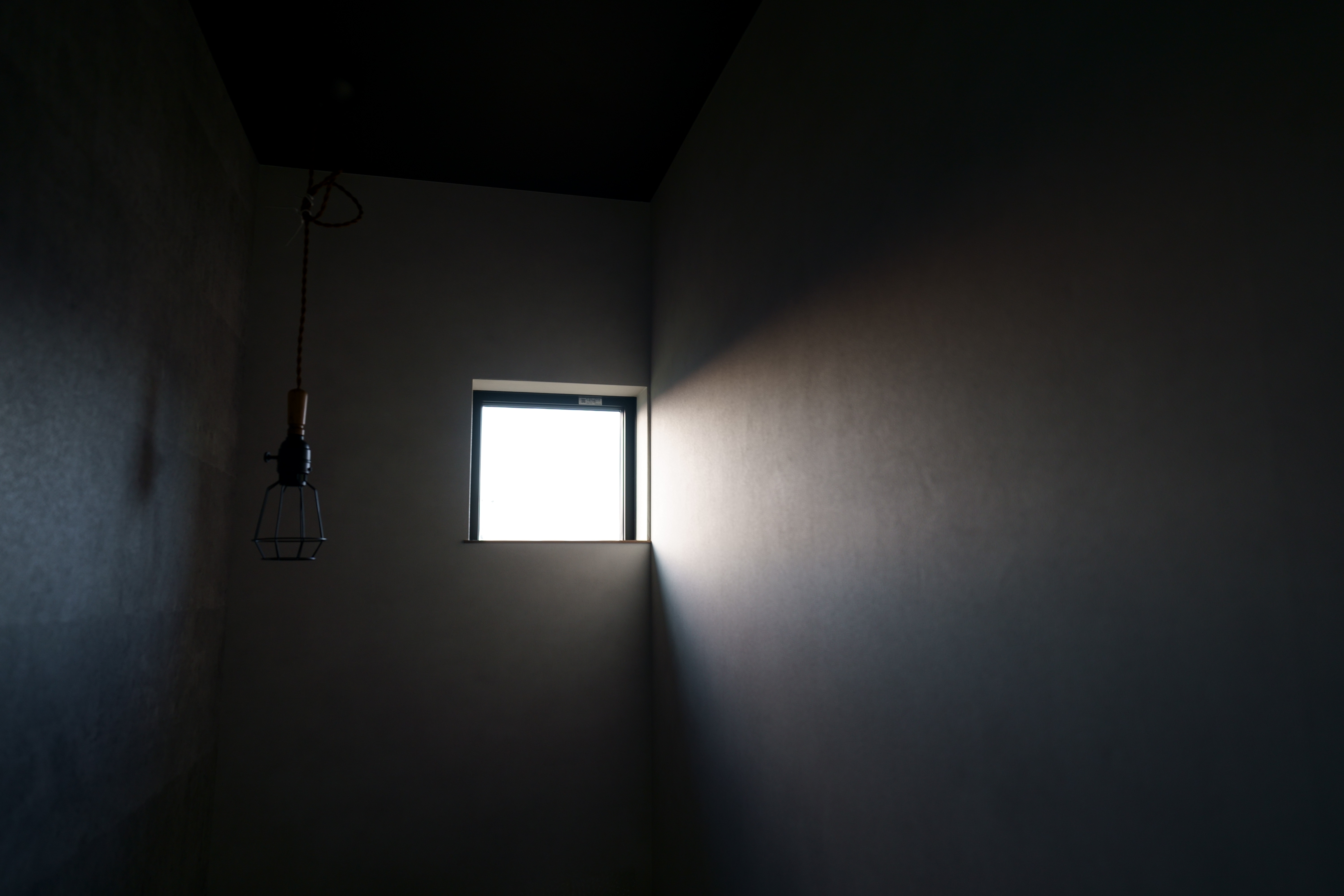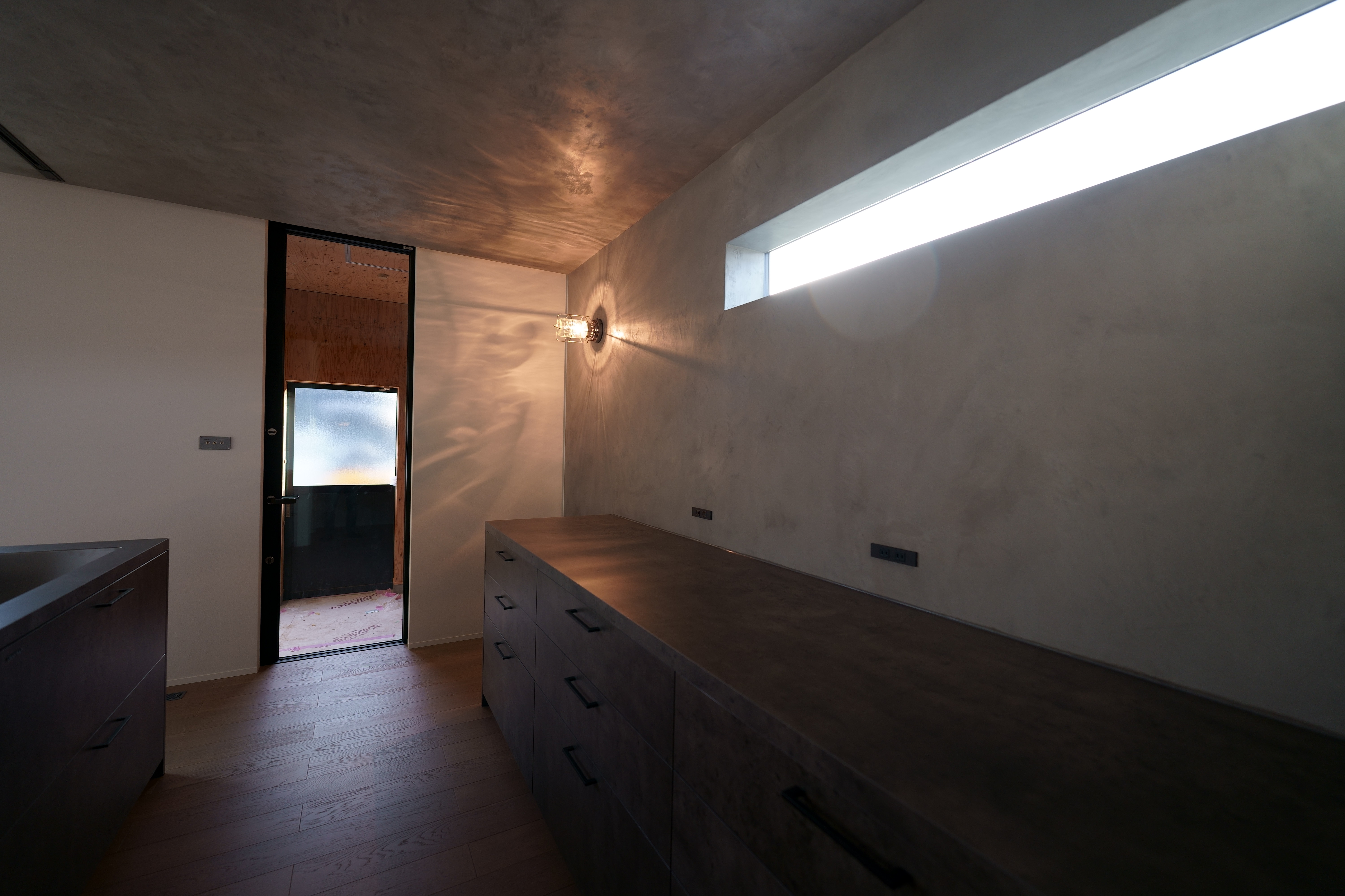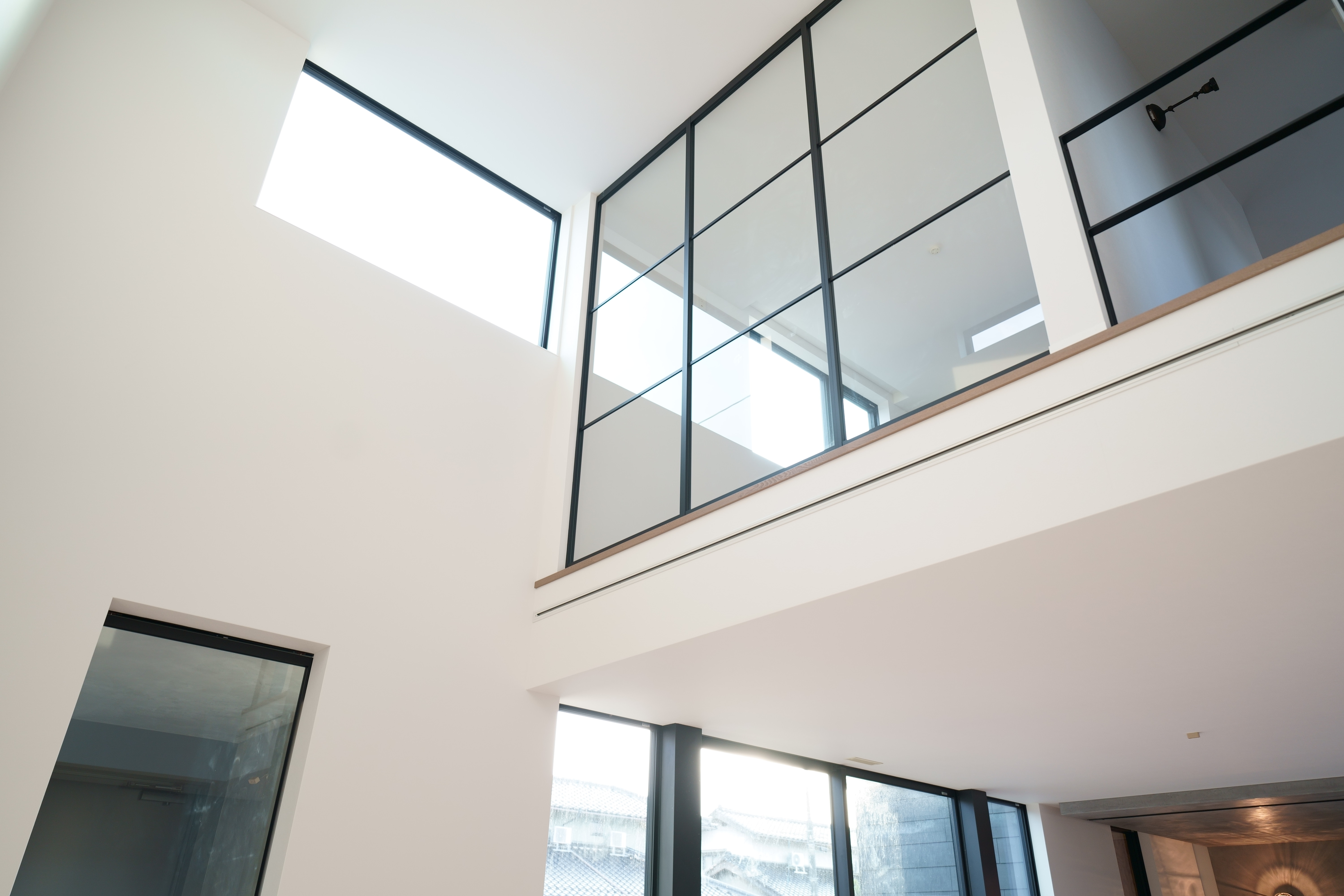 窓から自然光が差し込む開放的な吹き抜け空間と、コンクリート調のキッチン・壁面が美しいコントラストを生む家。 階段やシンプルな照明が、空間に引き締まった印象を与えます。 素材感を活かしたミニマルなデザインで、落ち着きと洗練を両立した住まいです。 [中野町 I様邸 / 2022.11]