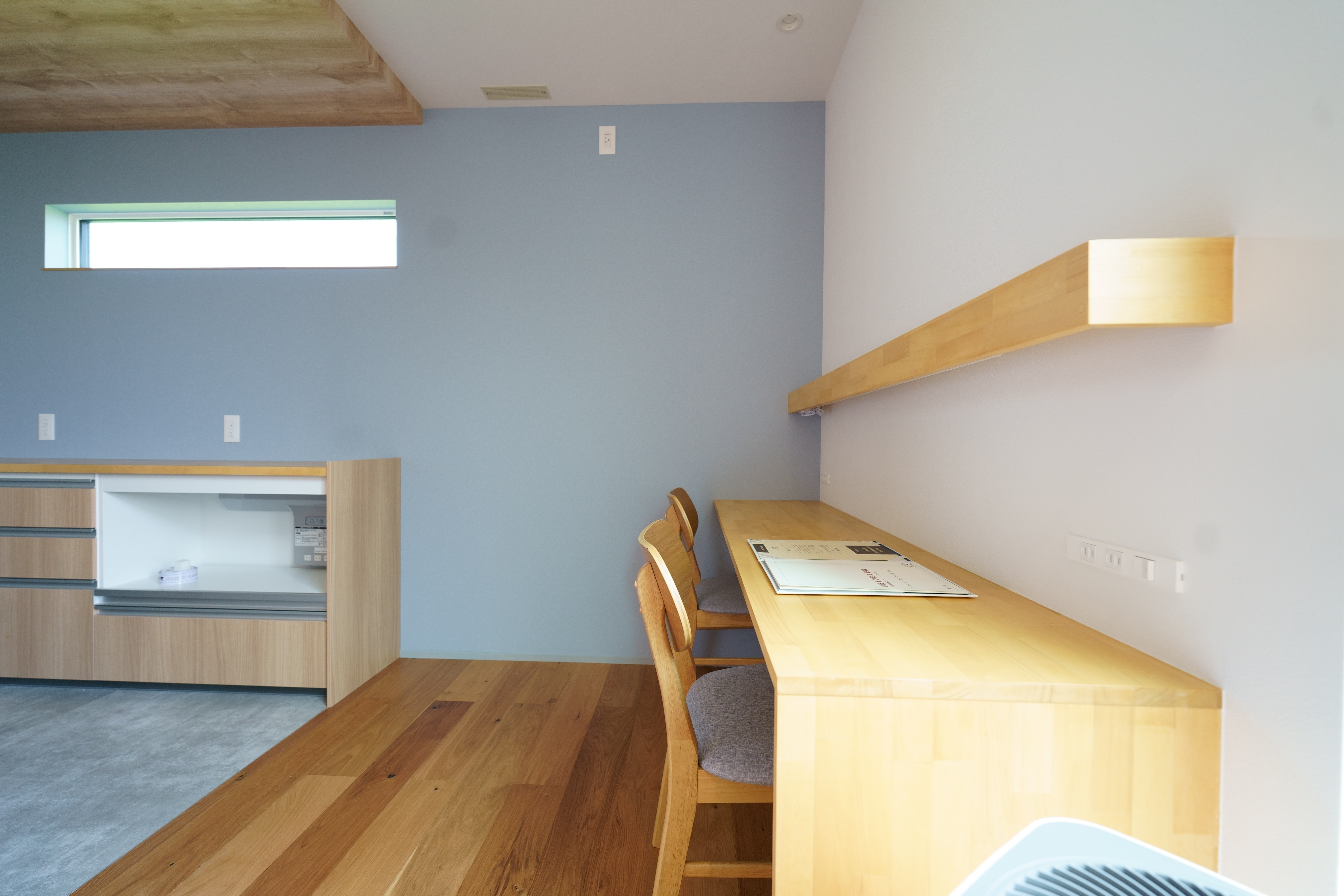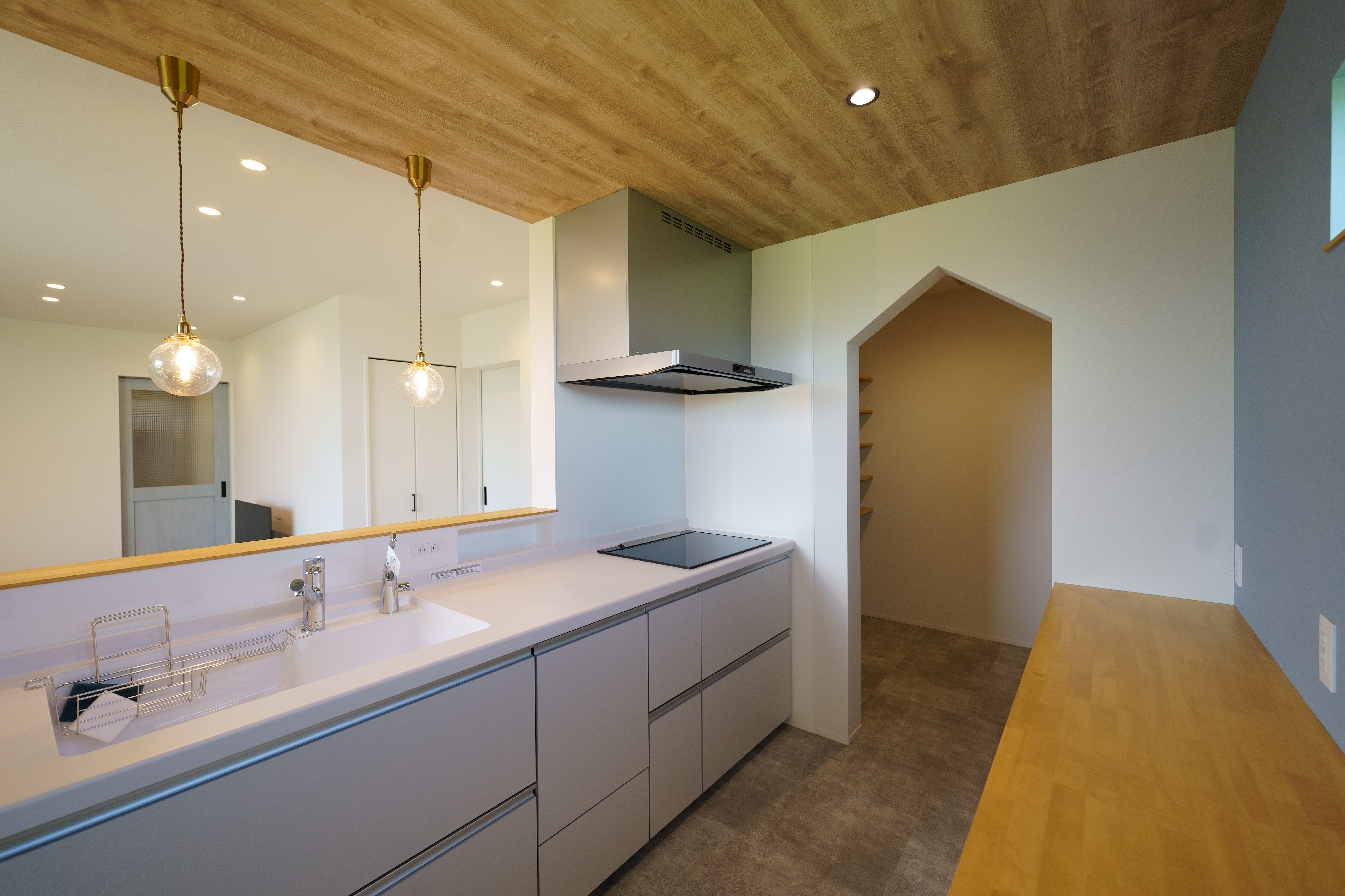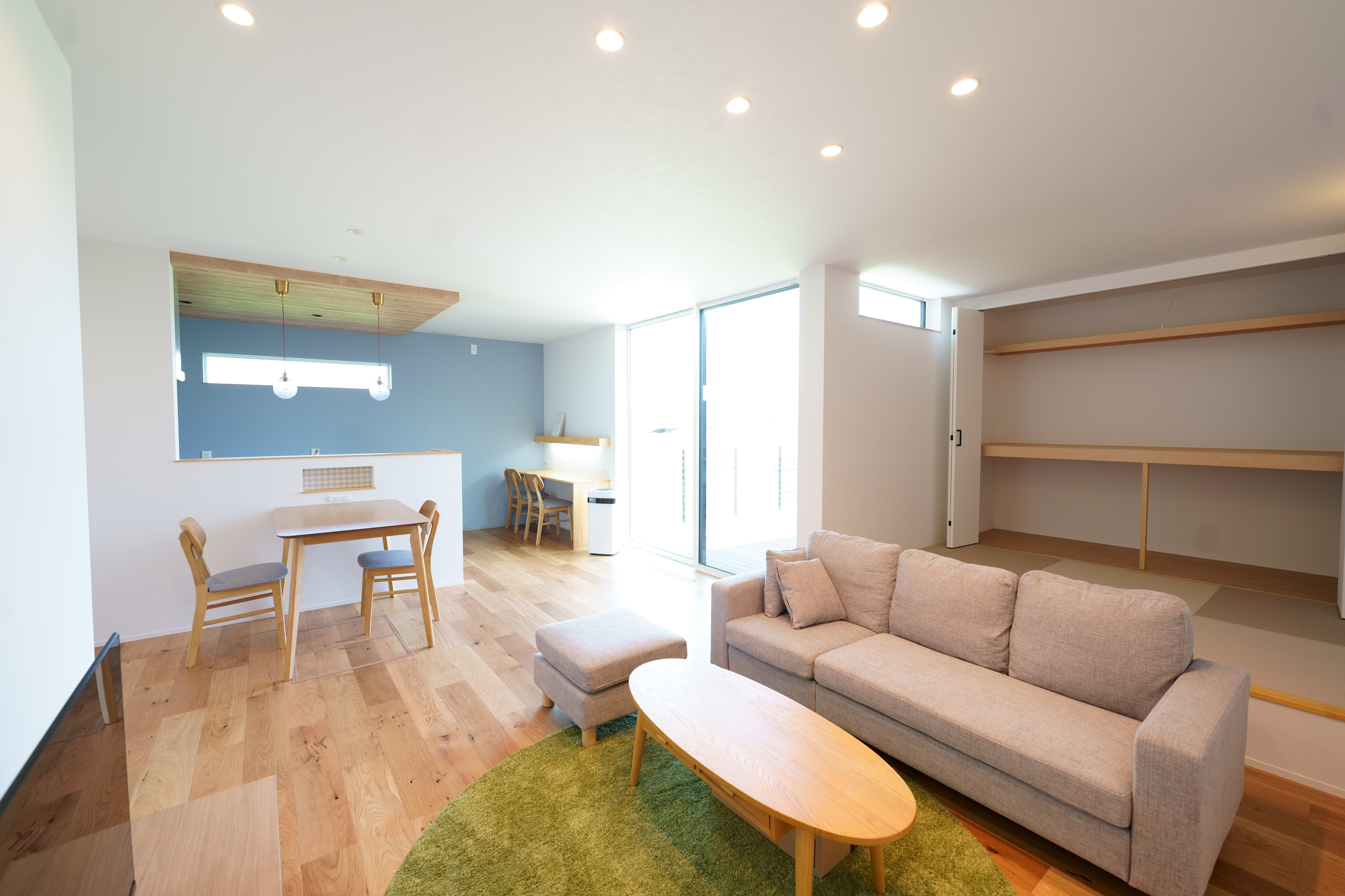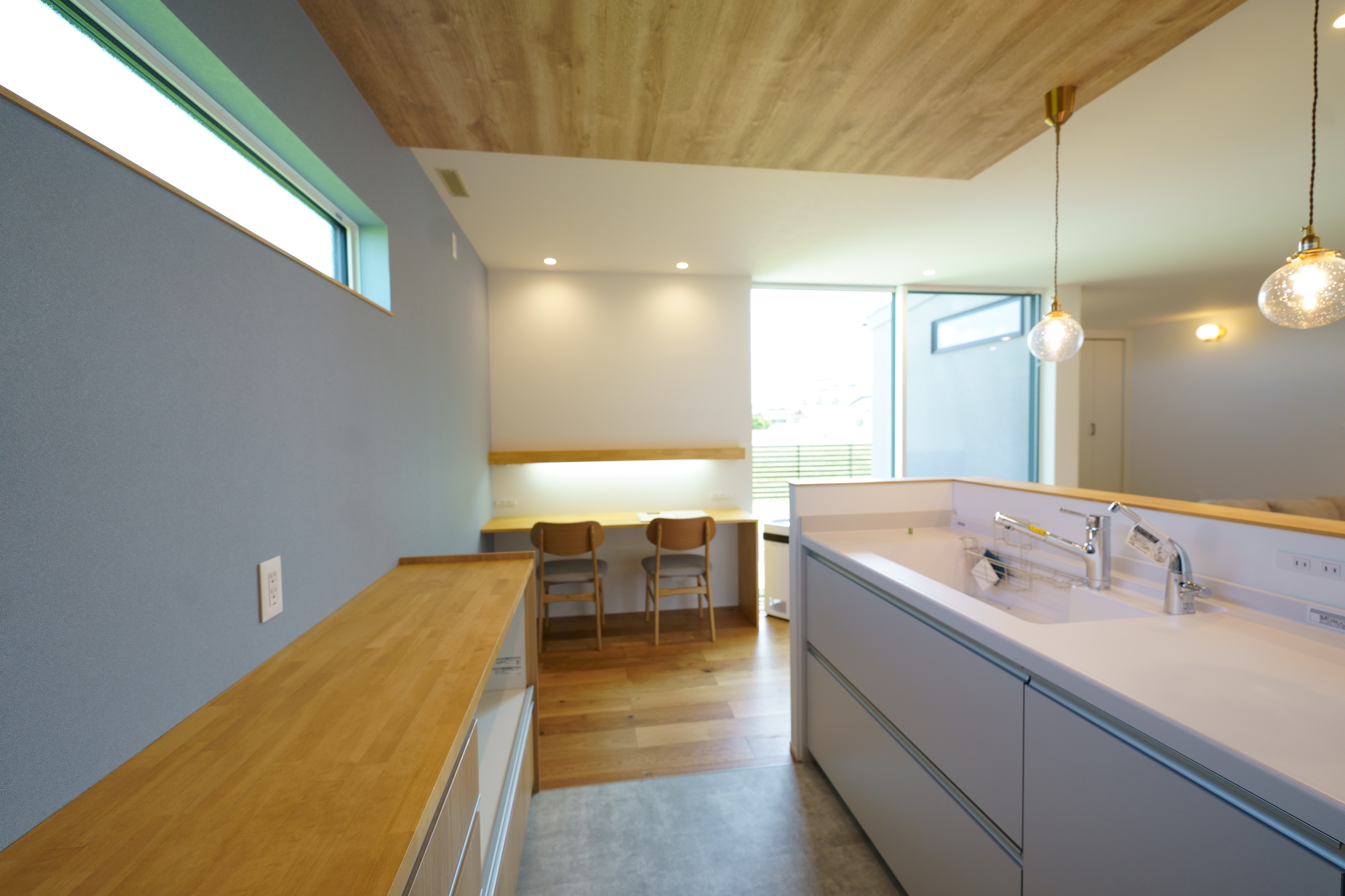 自然光がたっぷり差し込むリビング・ダイニングは、木目の天井とやわらかいブルーの壁が心地よい空間を演出。 キッチンからパントリー、ランドリーまでをスムーズに結ぶ家事動線で、生活も快適に。 シンプルながらも機能性を重視した、暮らしやすさにこだわった住宅です。 [斐川町 N様邸 / 2022.8]