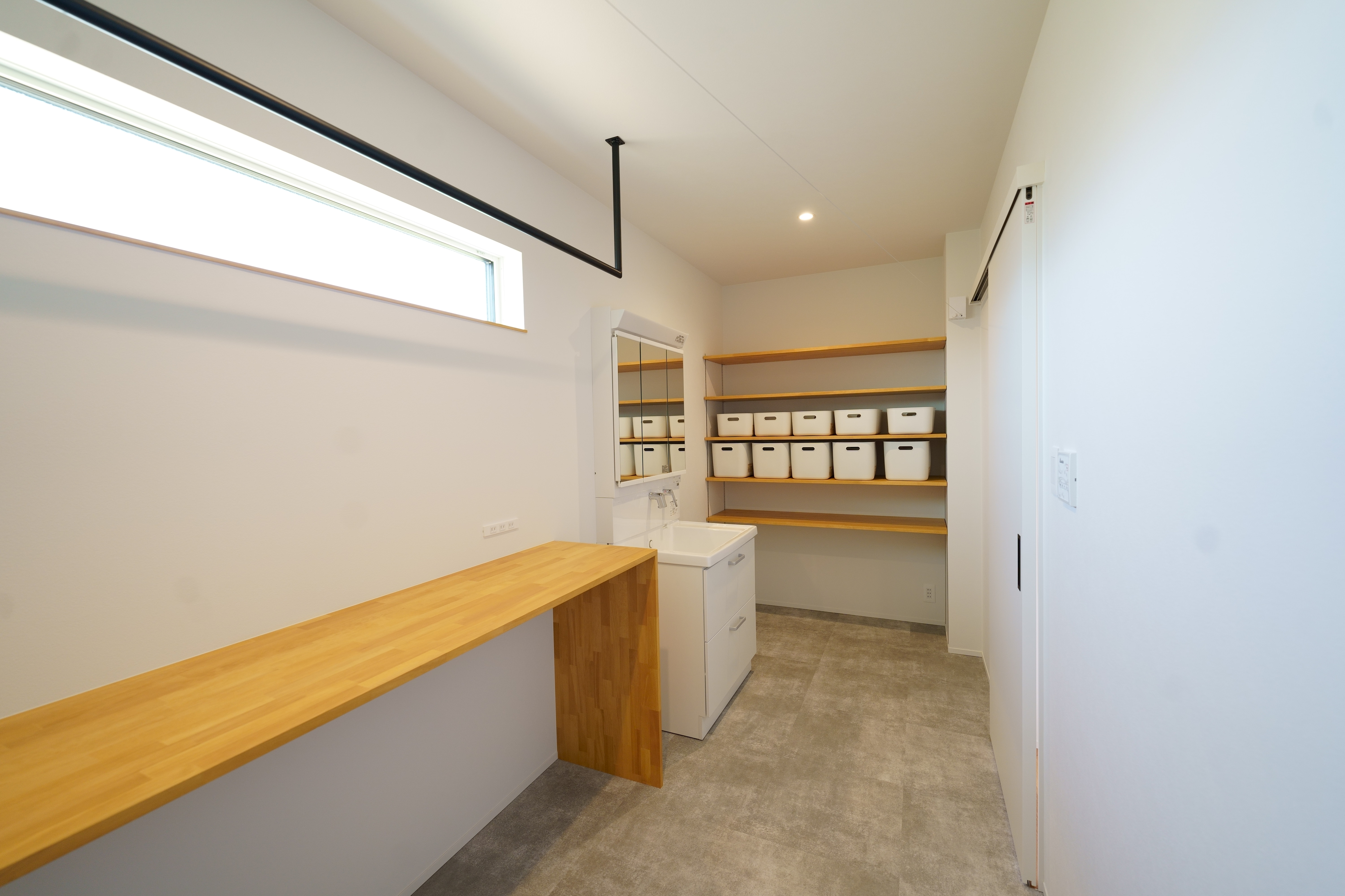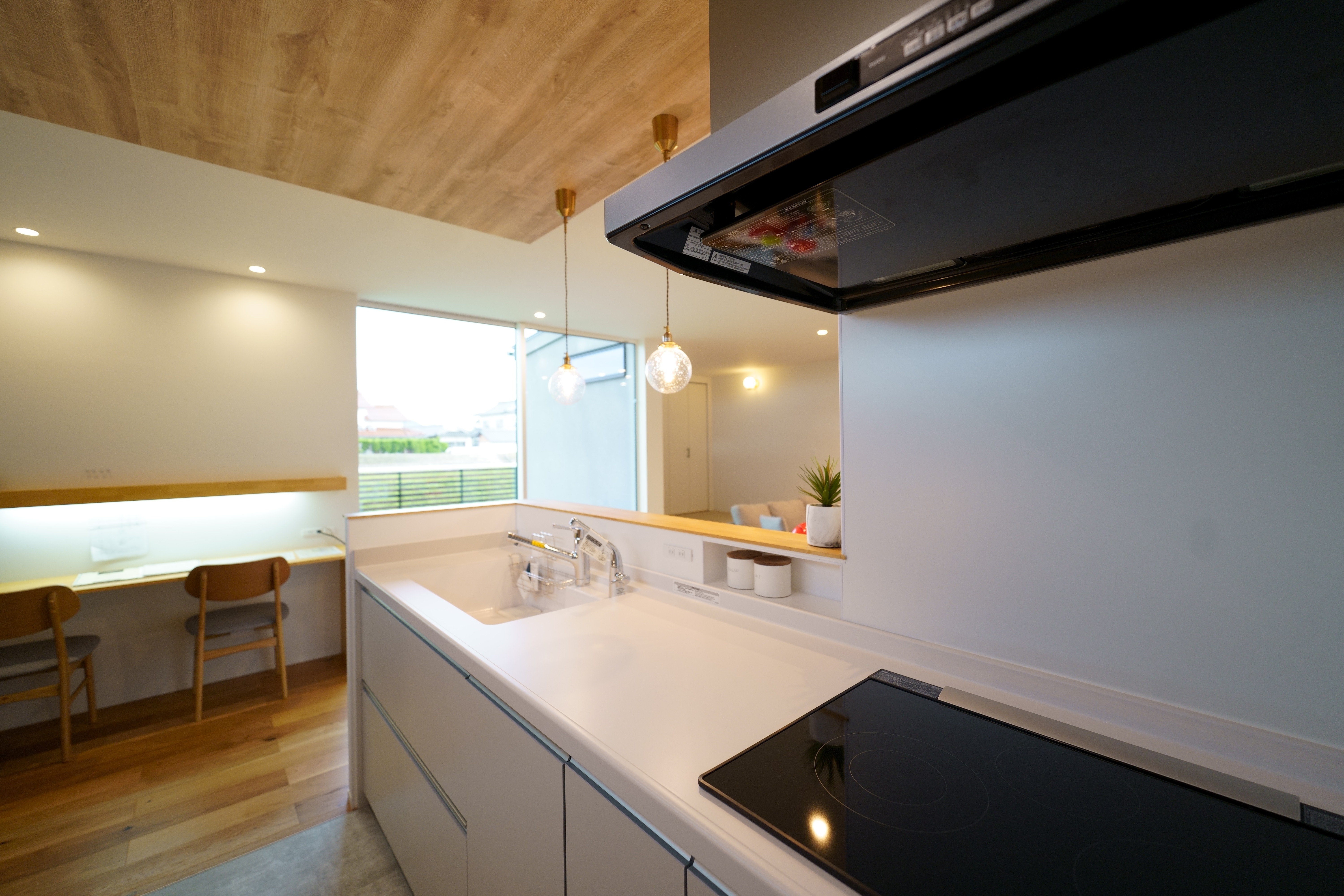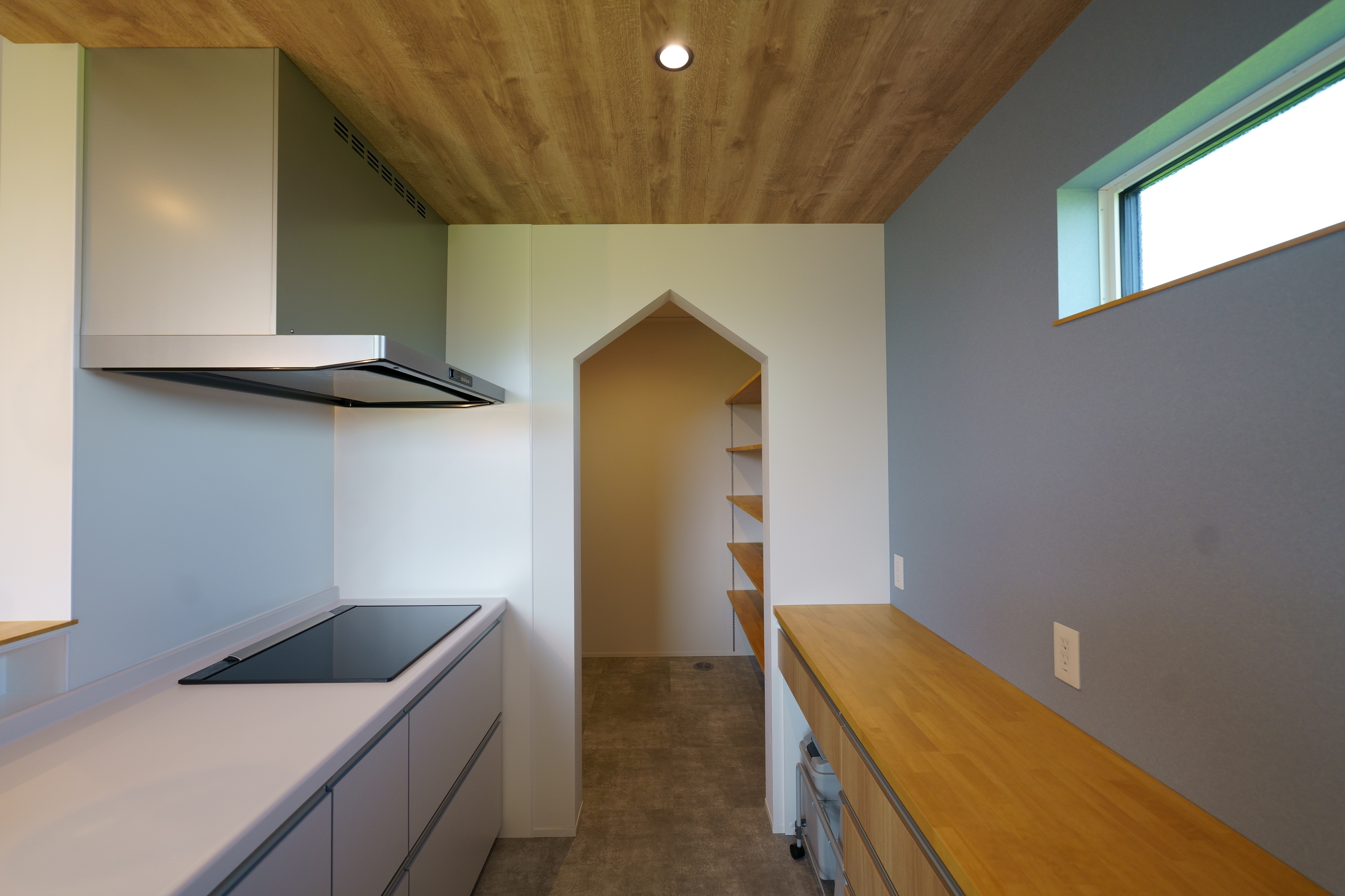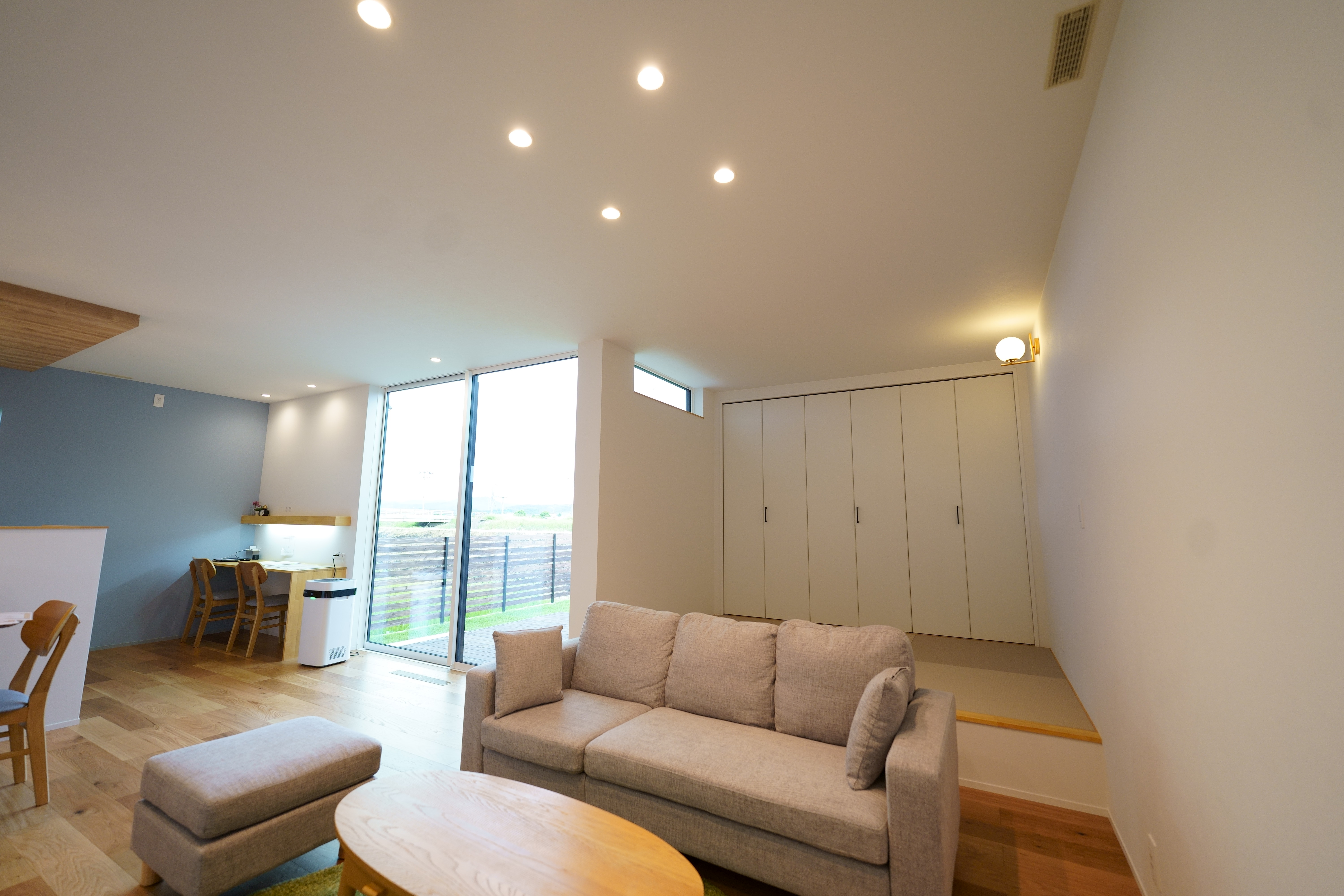 自然光がたっぷり差し込むリビング・ダイニングは、木目の天井とやわらかいブルーの壁が心地よい空間を演出。 キッチンからパントリー、ランドリーまでをスムーズに結ぶ家事動線で、生活も快適に。 シンプルながらも機能性を重視した、暮らしやすさにこだわった住宅です。 [斐川町 N様邸 / 2022.8]