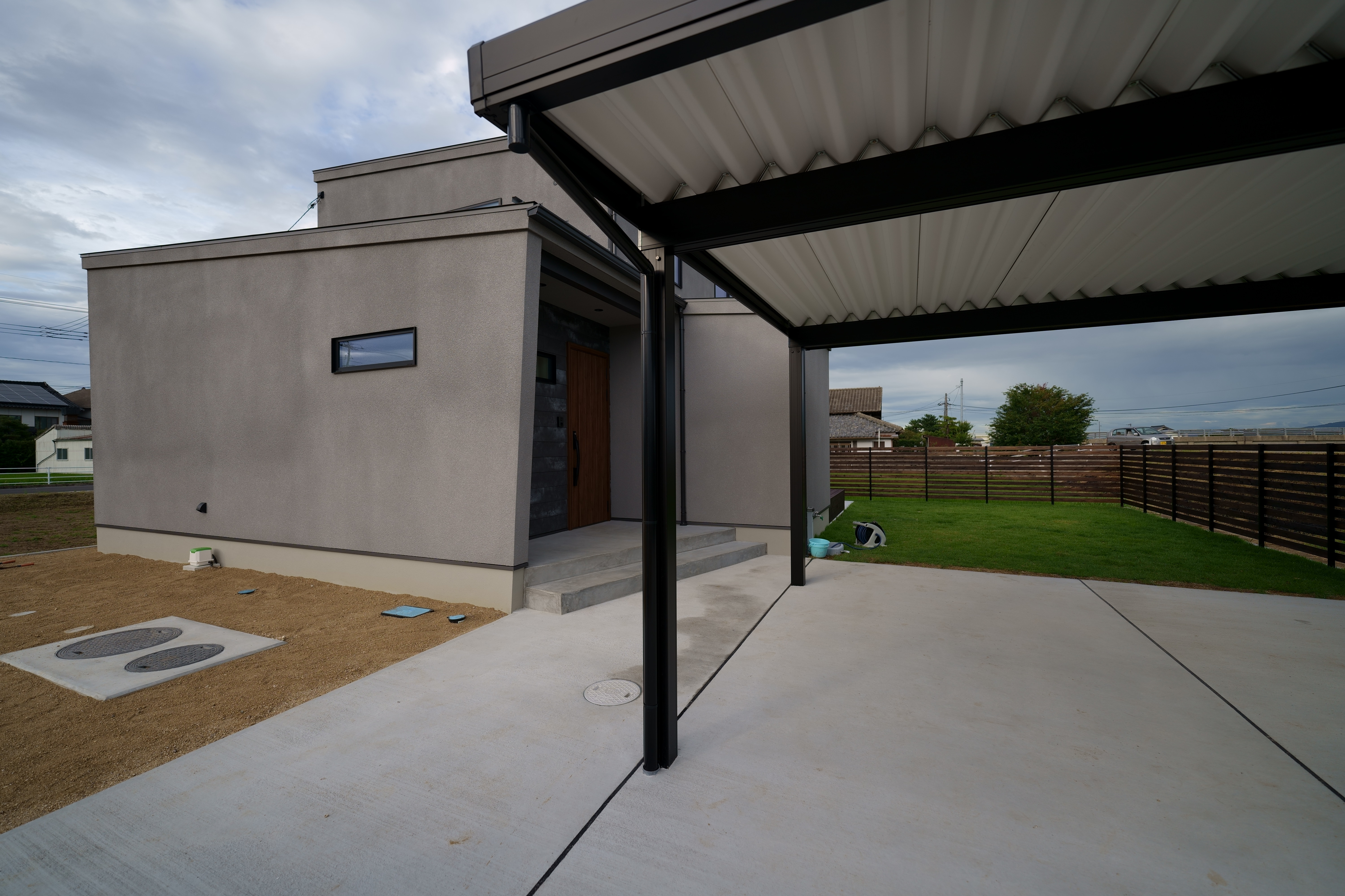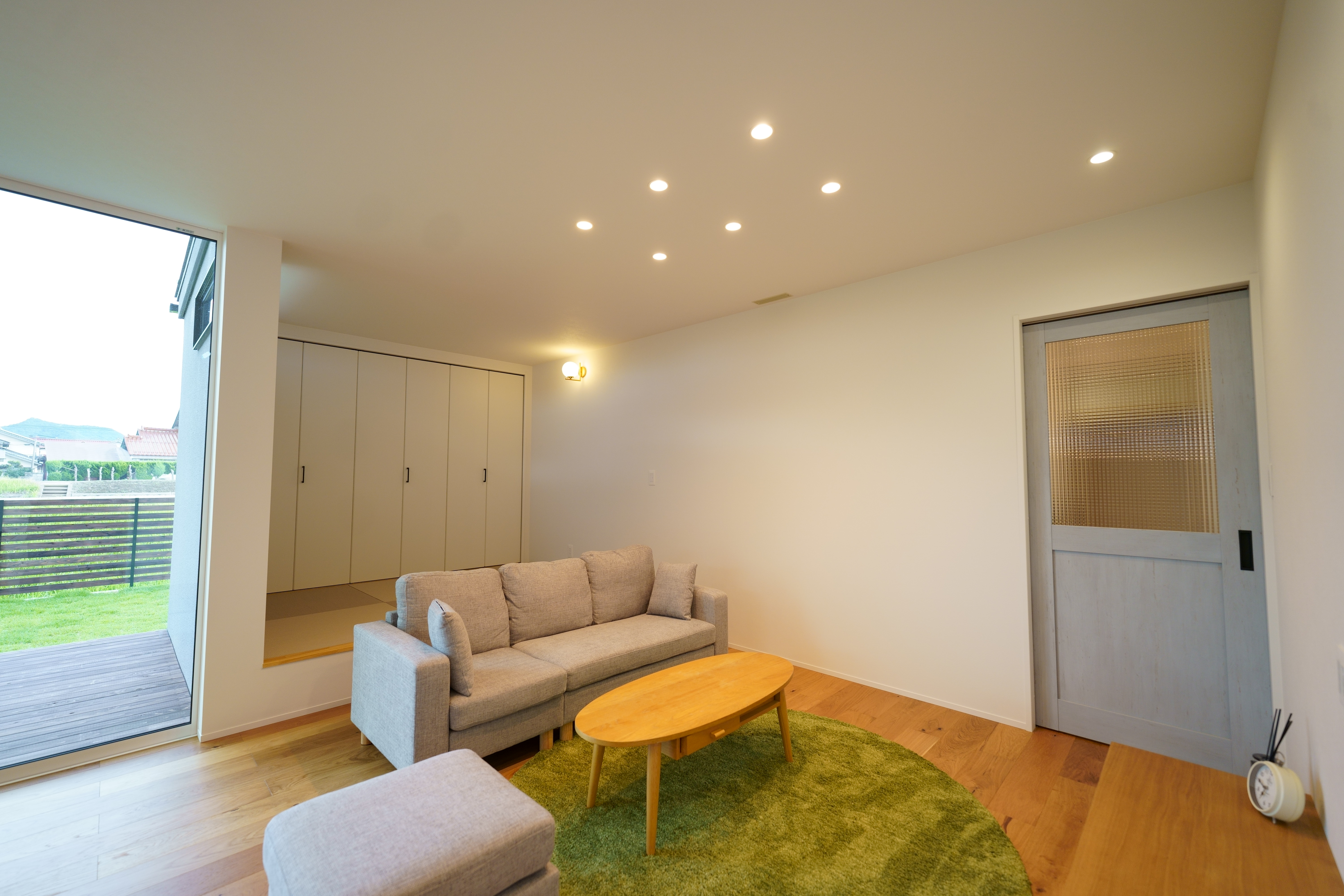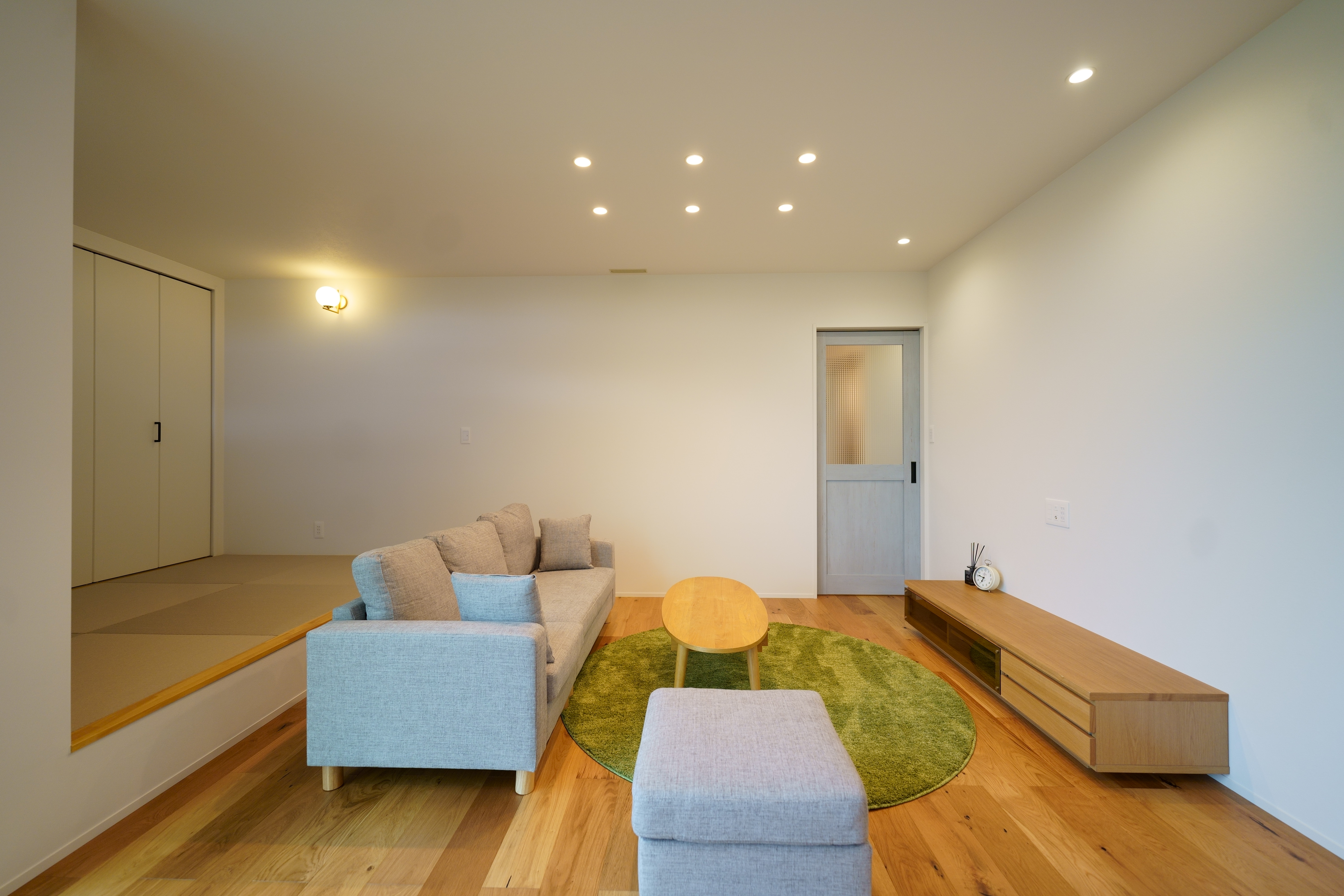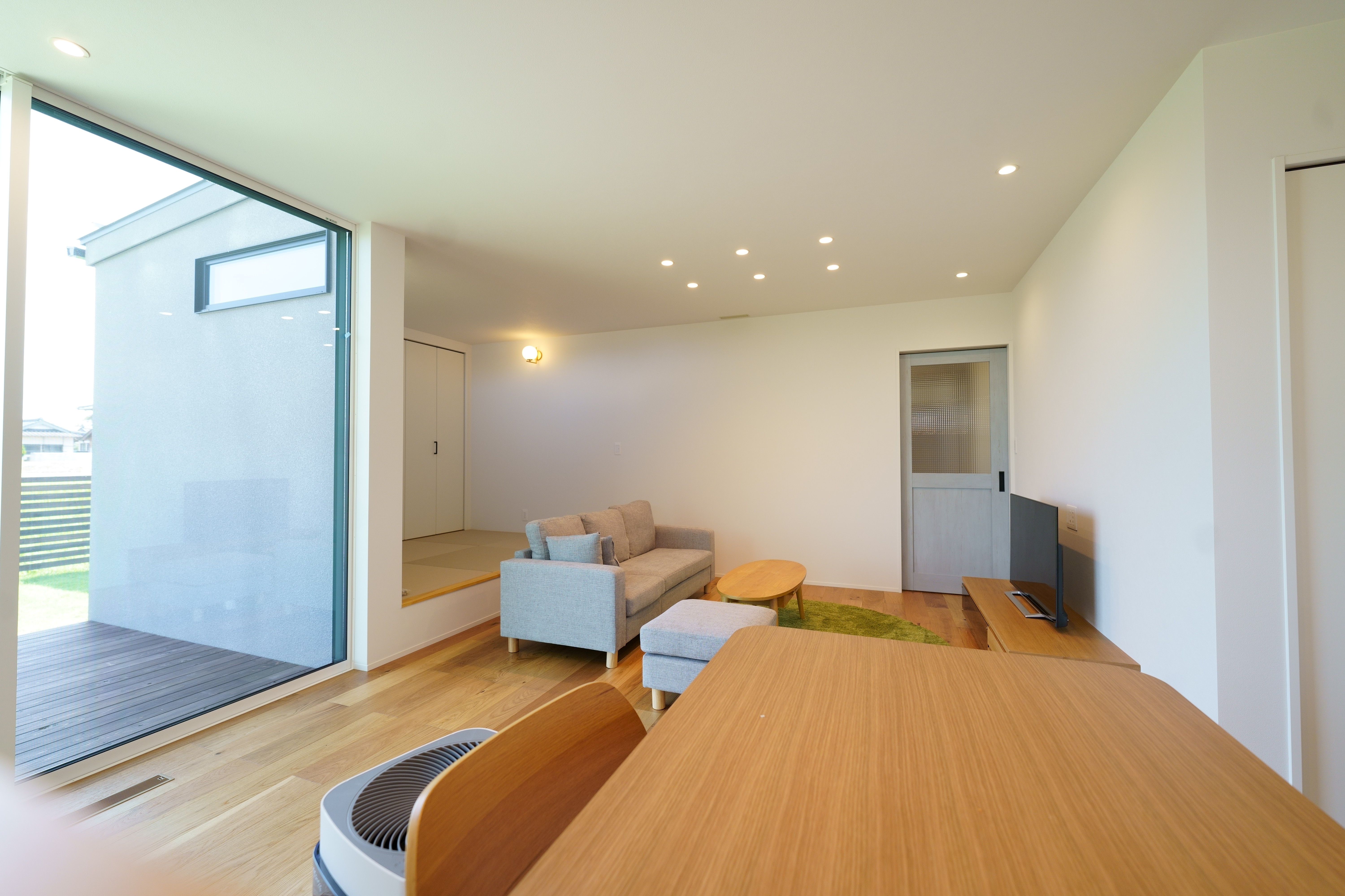 自然光がたっぷり差し込むリビング・ダイニングは、木目の天井とやわらかいブルーの壁が心地よい空間を演出。 キッチンからパントリー、ランドリーまでをスムーズに結ぶ家事動線で、生活も快適に。 シンプルながらも機能性を重視した、暮らしやすさにこだわった住宅です。 [斐川町 N様邸 / 2022.8]